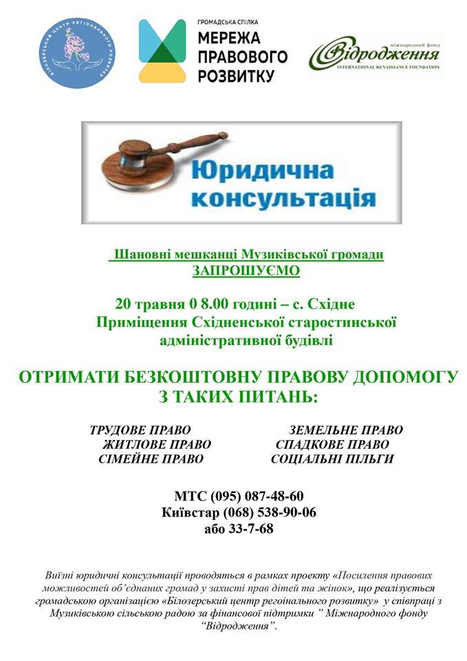 Шановні мешканці Музиківської громади, запрошуємо Вас отримати безкоштовну юридичну консультацію!