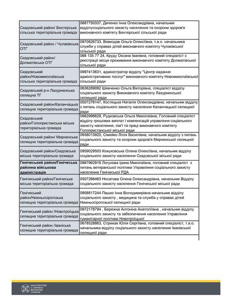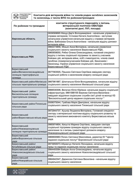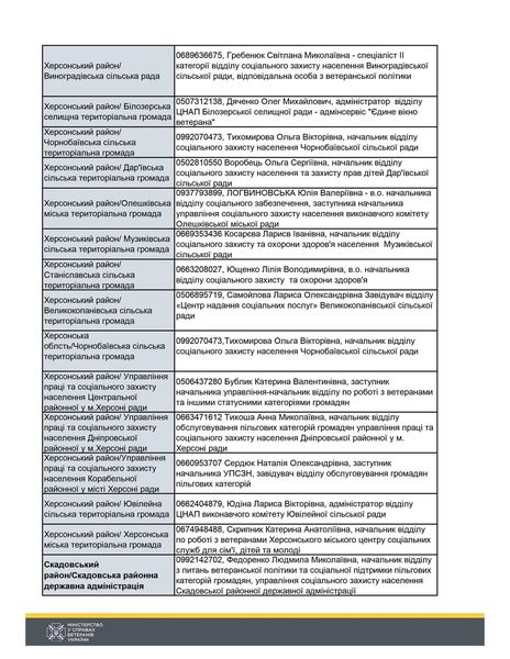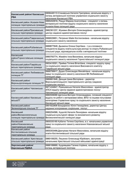 Контакти структурного підрозділу /спеціаліста з питань ветеранської політики ХОВА і громад Херсонської області.
