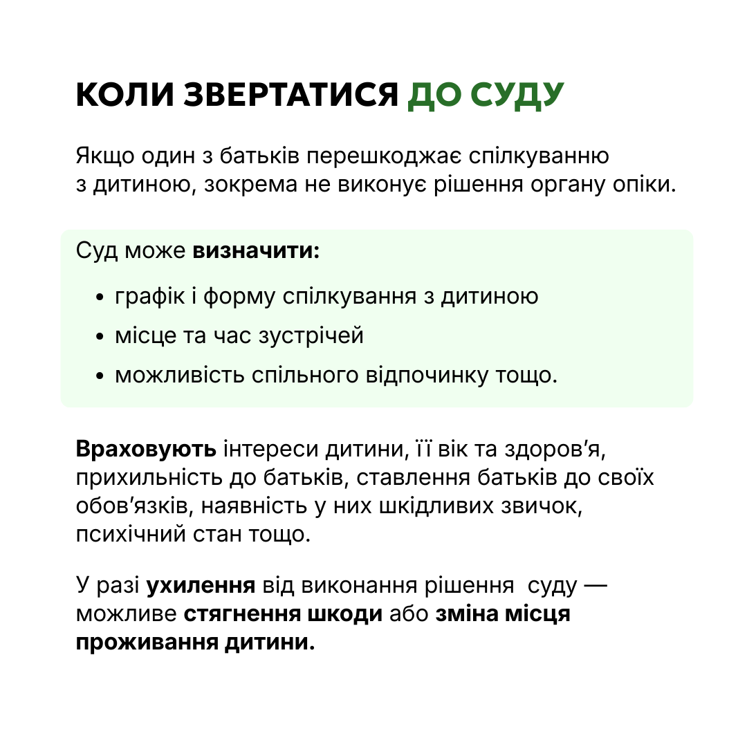 Той із батьків, хто живе окремо, має право брати участь у вихованні та спілкуватися з дитиною, а інший не має права цьому перешкоджати, якщо це не шкодить дитині.