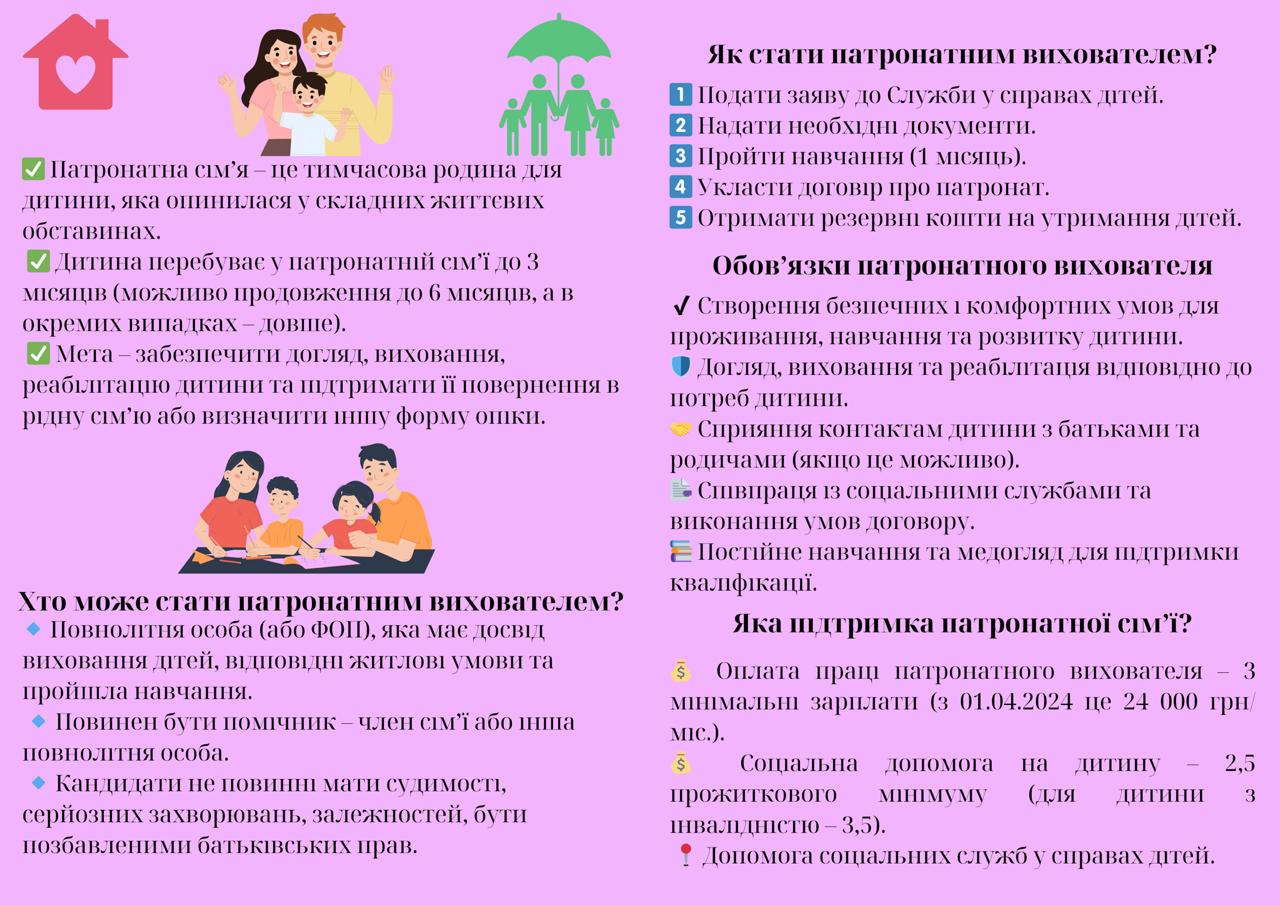 Патронатна родина – це форма тимчасового догляду за дитиною, яка опинилася в складних життєвих обставинах і потребує захисту на нетривалий період часу. Такі родини надають дитині не тільки житло, але й підтримку, виховання та необхідні умови для розвитку, поки її ситуація не буде вирішена.