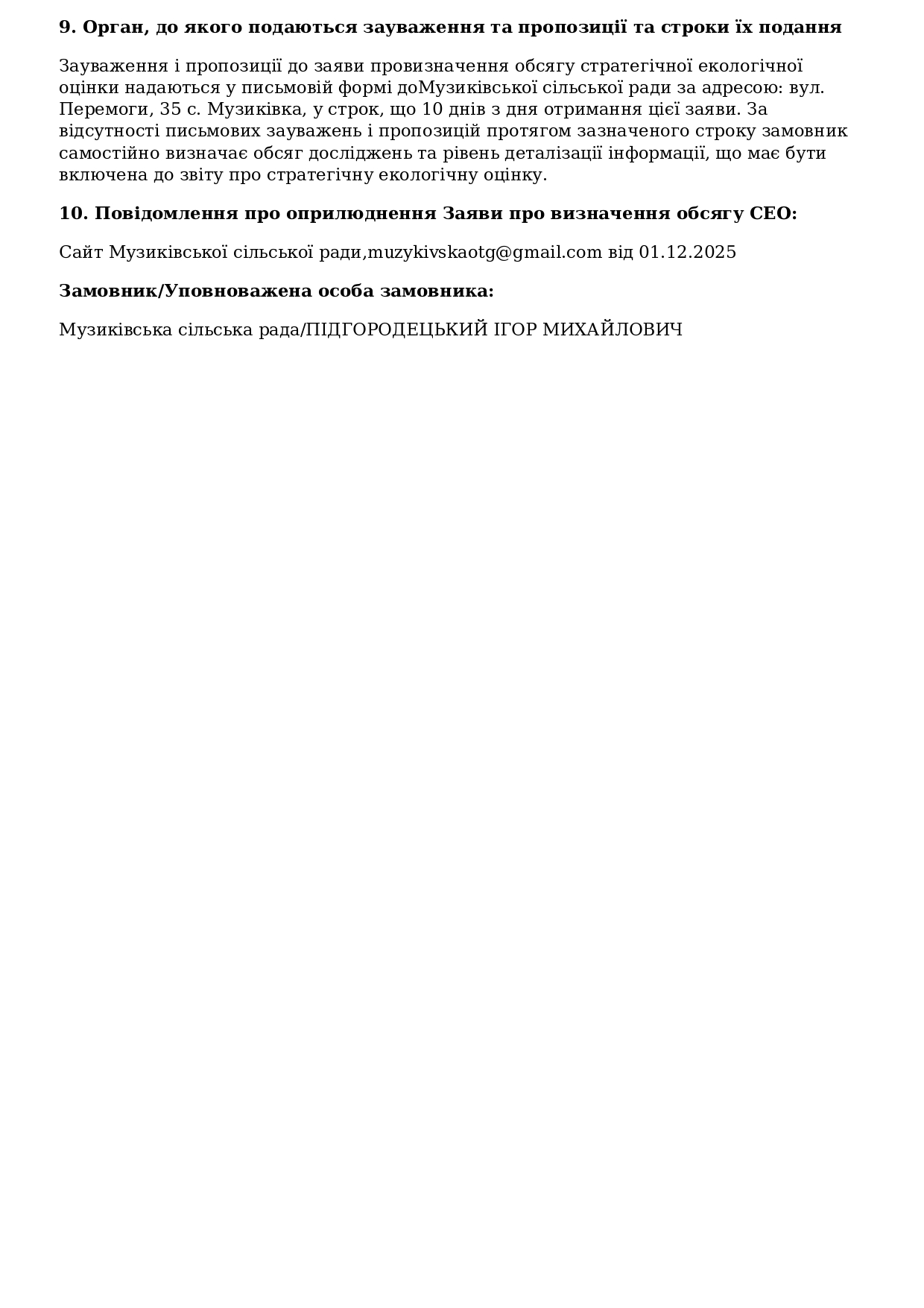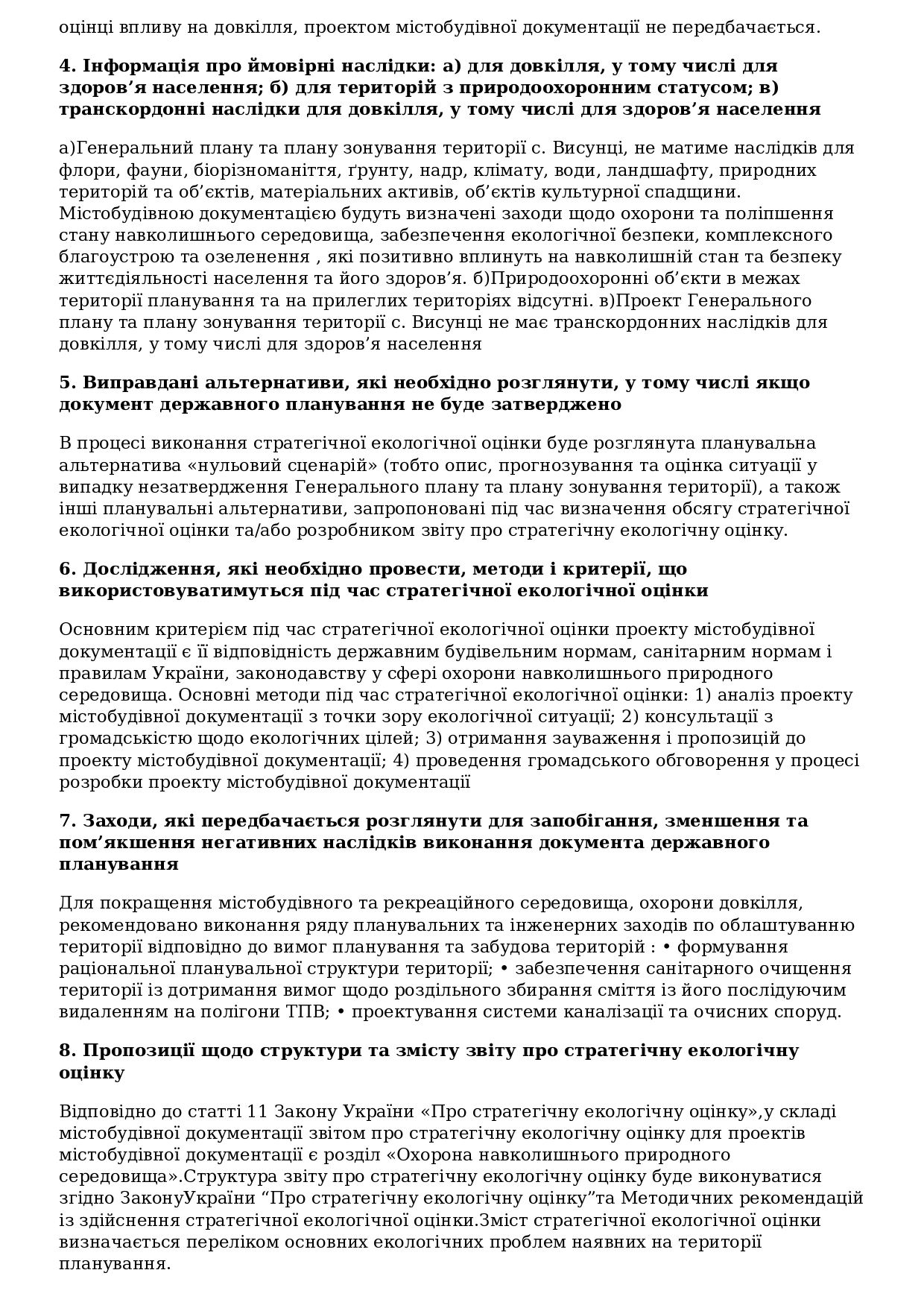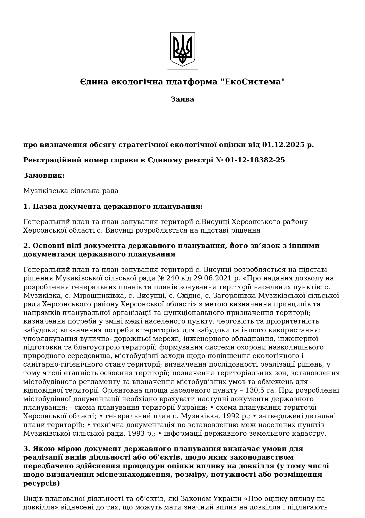 Заява про визначення обсягу стратегічної екологічної оцінки генерального плану території с.Висунці Музиківської територіальної громади Херсонського району Херсонської області
