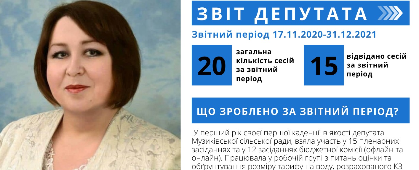 У перший рік своєї першої каденції в якості депутата Музиківської сільської ради, взяла участь у 15 пленарних засіданнях та у 12 засіданнях бюджетної комісії (офлайн та онлайн). Працювала у робочій групі з питань оцінки та обґрунтування розміру тарифу на воду, розрахованого КЗ "Струмок-2".